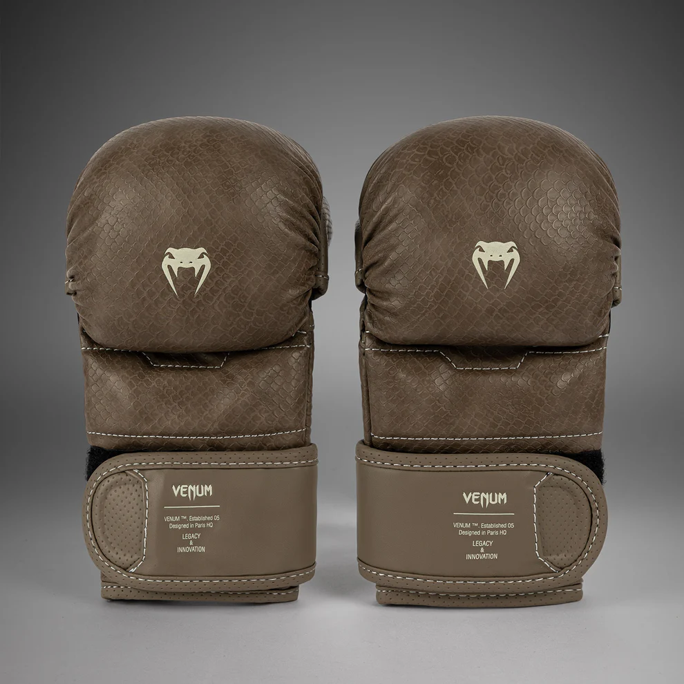 Bēšās šuves seko cimda anatomiskajām līnijām, radot smalku kontrasta efektu. Savukārt teksturētās “zvīņas” pa visu virsmu atgādina, ka ar Venum jāuzbrūk ātri un spēcīgi.